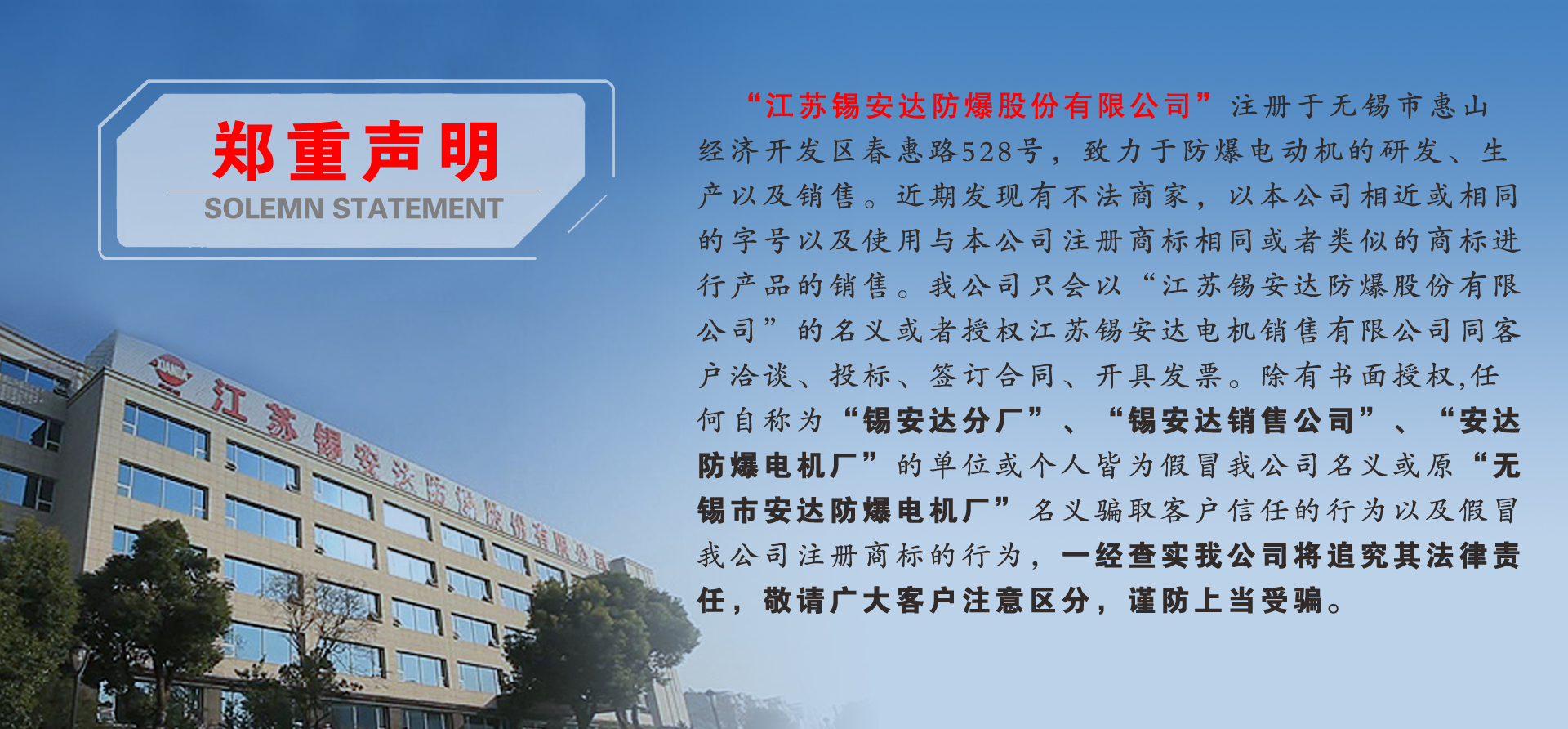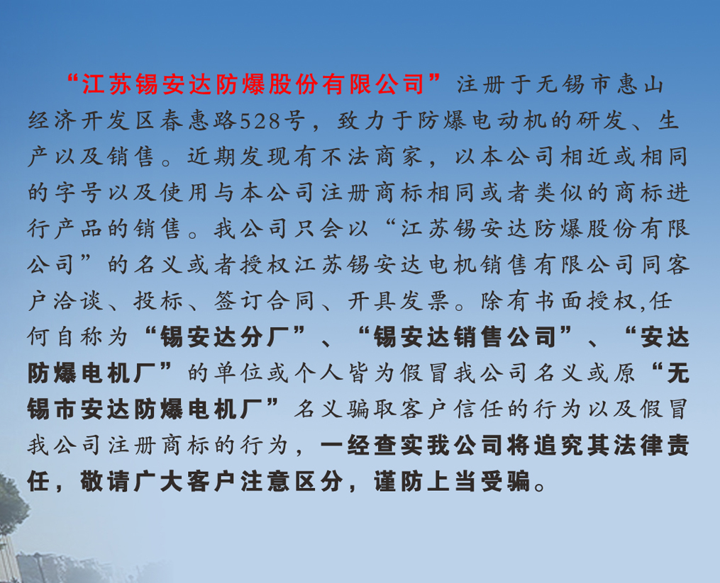 江蘇錫安達(dá)防爆股份有限公司由無(wú)錫市安達(dá)防爆電機(jī)廠(chǎng)和江蘇安達(dá)防爆機(jī)電集團(tuán)有限公司組建而成,從1986年起開(kāi)始生產(chǎn)防爆電機(jī),是首批獲得全國(guó)工業(yè)產(chǎn)品生產(chǎn)許可證的防爆電機(jī)企業(yè)。